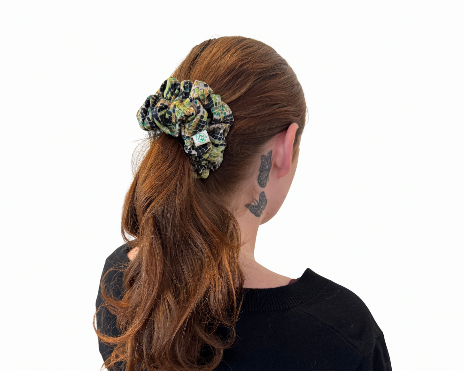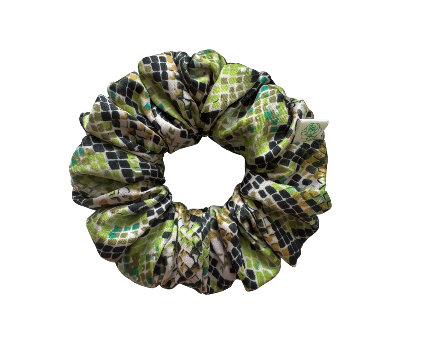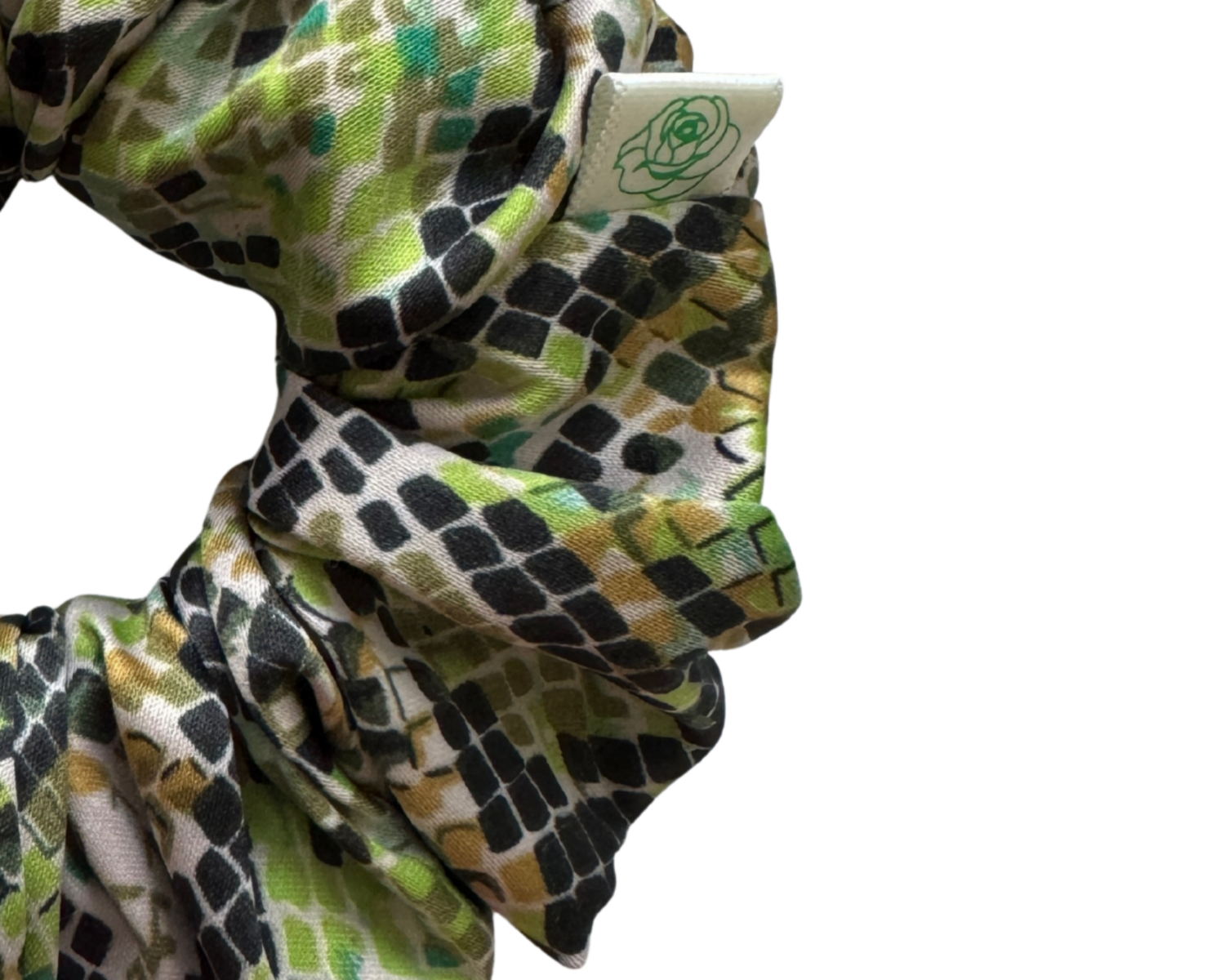 Elevate your hairstyle with our Classic Rose Emerald Mosaic scrunchie. Crafted from polyester satin, this scrunchie is luxuriously smooth, soft, and lightweight, providing a gentle lift without tugging. Its rich emerald tones and mosaic-inspired design bring a vibrant, sophisticated touch to any look, perfect for everyday wear or special occasions.