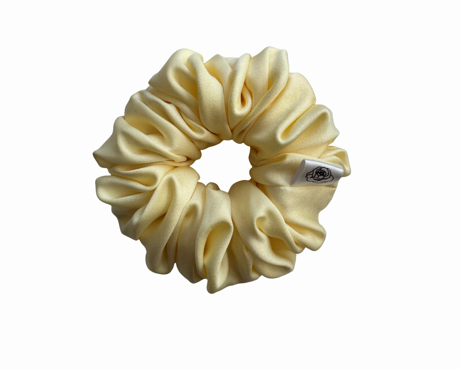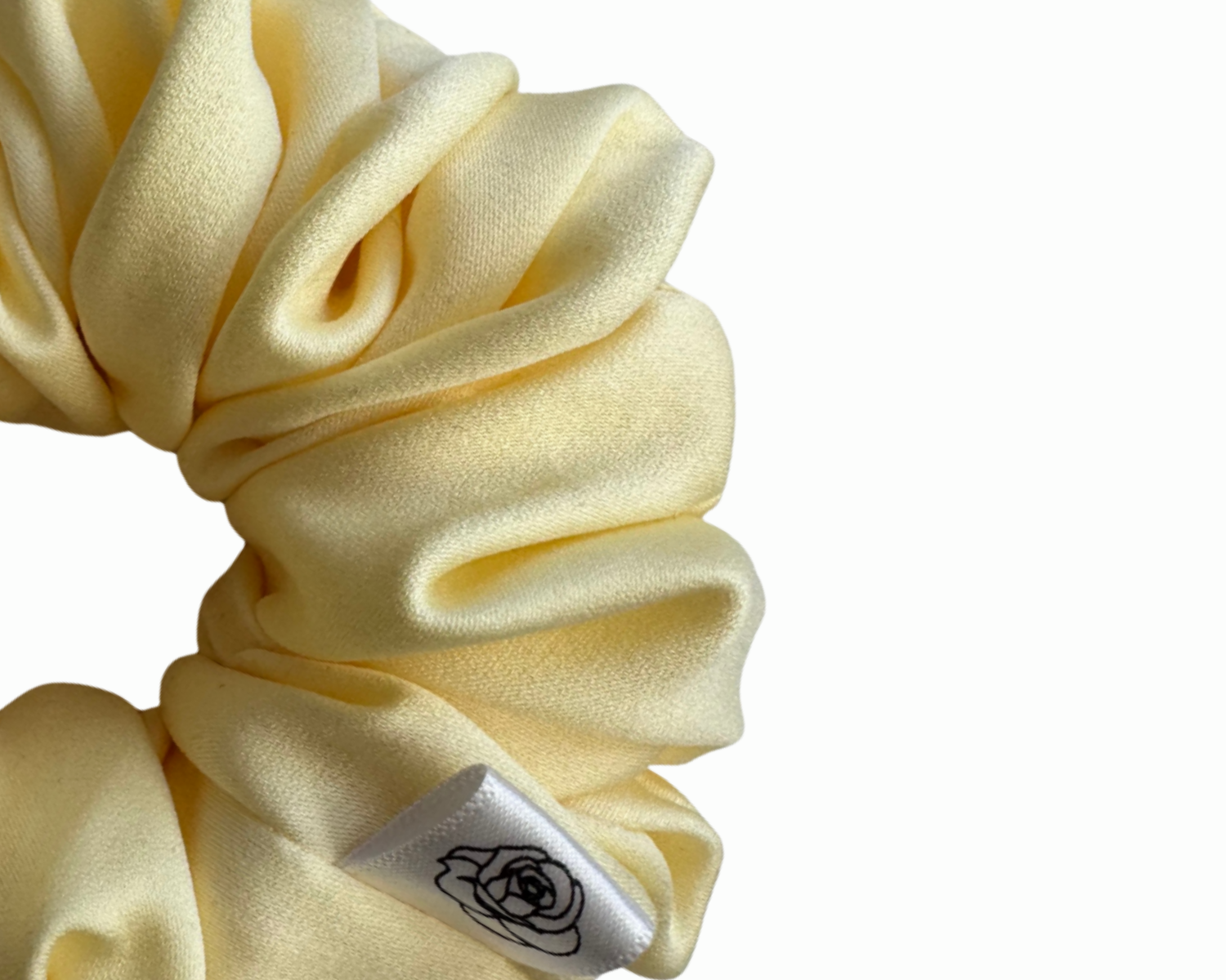 Soft, sunny, and full of charm — the Lemon Soufflé scrunchie brings a touch of sweetness to your everyday look. Made from smooth satin polyester, this delicate baby yellow scrunchie adds a soft glow to your hair, catching the light with a gentle sheen.